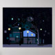 moody city night lights tree and suburban houses in this digital art work by Anna Casey
