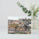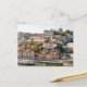 This postcard features a breathtaking panoramic view of the historic Ribeira district in Porto, Portugal, captured during the soft light of golden hour. The image showcases the city's iconic, colorful architecture tiered along the hillside, overlooking the bustling Douro River with traditional boats anchored below. It is a perfect keepsake for travelers or a beautiful way to send a note to loved ones from one of Europe's most charming coastal cities.