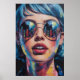The woman has piercing blue hair and is wearing stylish, round sunglasses. The most captivating feature is the reflection of a colorful, stylized cityscape within the lenses of her glasses, which gives the painting its urban and modern feel.