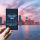 A vertical business card in a modern & minimalist style, using a dark background for a drone pilot & drone activities: aerial photography, drone pilot, agricultural drone, rental, city photographies, etc. It comes with an illustration of a drone carrying a camera and flying above a city with skyscrapers.