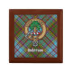 Clan Anderson crest badge surrounded by a strap and buckle over tartan background. Custom text.