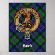 Clan Baird crest badge surrounded by a strap and buckle over tartan background. Custom text.