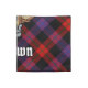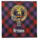 Clan Brown crest badge surrounded by a strap and buckle over tartan background. Custom text.