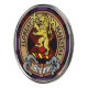 Clan Brown crest badge surrounded by a strap and buckle over tartan background. Custom text.