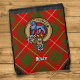 Clan Bruce crest badge surrounded by a strap and buckle over tartan background. Custom text.