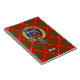 Clan Bruce crest badge surrounded by a strap and buckle over tartan background. Custom text.