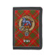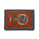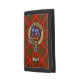 Clan Bruce crest badge surrounded by a strap and buckle over tartan background. Custom text.