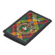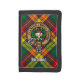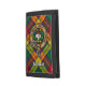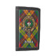 Buchanan crest badge surrounded by a strap and buckle over clan tartan background. Custom text.