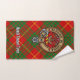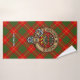 Clan Cameron crest badge surrounded by a strap and buckle over tartan background. Custom text on each towel.