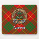 Clan Cameron crest badge surrounded by a strap and buckle over tartan background. Custom text.