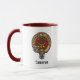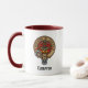 Clan Cameron crest badge surrounded by a strap and buckle over tartan background. Custom text on both sides.