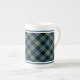 Bone china mug with the Campbell of Loch Awe family clan tartan pattern. Traditional vintage Scottish plaid from 1770 in light blue and green, with black accents.