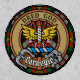 Clan Carnegie crest badge surrounded by a strap and buckle over dress tartan background. Custom text.