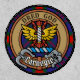 Clan Carnegie crest badge surrounded by a strap and buckle over tartan background. Custom text.