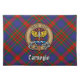 Clan Carnegie crest badge surrounded by a strap and buckle over tartan background. Custom text.