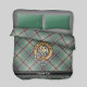 Clan Craig crest badge surrounded by a strap and buckle over tartan background. Custom text.