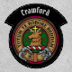 Clan Crawford crest badge surrounded by a strap and buckle over tartan background. Custom text.
