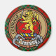 Clan Cumming crest badge surrounded by a strap and buckle over tartan background. Custom text.