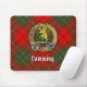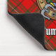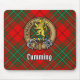 Clan Cumming crest badge surrounded by a strap and buckle over tartan background. Custom text.
