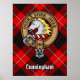 Clan Cunningham crest badge surrounded by a strap and buckle over tartan background. Custom text.