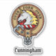 Clan Cunningham crest badge surrounded by a strap and buckle over tartan background. Custom text.
