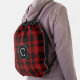 Classic plaid drawstring backpack done in the traditional Scottish red, black, white clan Cunningham tartan plaid pattern. Personalize the white one letter monogram, for yourself or as a great gift idea.