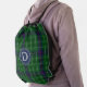 Classic plaid drawstring backpack done in the traditional Scottish green, blue, black, red, and white clan Duncan tartan plaid pattern. Personalize the white one letter monogram, for yourself or as a great gift idea.
