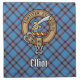 Clan Elliot crest badge surrounded by a strap and buckle over ancient tartan background. Custom text.