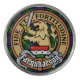 Clan Farquharson crest badge surrounded by a strap and buckle over tartan background. Custom text.