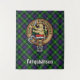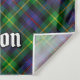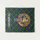 Clan Farquharson crest badge surrounded by a strap and buckle over tartan background. Custom text.