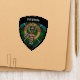 Clan Ferguson crest badge surrounded by a strap and buckle over tartan background. Custom text.
