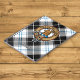 Clan Forbes crest badge surrounded by a strap and buckle over dress tartan background. Custom text.