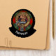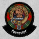 Clan Forrester crest badge surrounded by a strap and buckle over tartan background. Custom text.