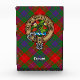 Clan Fraser crest badge surrounded by a strap and buckle over tartan background. Custom text.