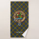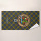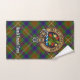 Clan Fraser crest badge surrounded by a strap and buckle over hunting tartan background. Custom text on each towel.