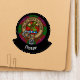 Clan Fraser crest badge surrounded by a strap and buckle over tartan background. Custom text.