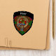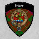 Clan Fraser crest badge surrounded by a strap and buckle over tartan background. Custom text.