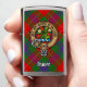 Clan Fraser crest badge surrounded by a strap and buckle over tartan background. Custom text.