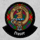 Clan Fraser of Lovat crest badge surrounded by a strap and buckle over tartan background. Custom text.