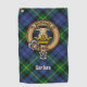 Clan Gordon crest badge surrounded by a strap and buckle over tartan background. Custom text.