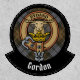 Clan Gordon crest badge surrounded by a strap and buckle over weathered tartan background. Custom text.
