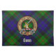 Clan Gunn crest badge surrounded by a strap and buckle over tartan background. Custom text.
