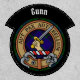 Clan Gunn crest badge surrounded by a strap and buckle over tartan background. Custom text.