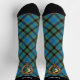 Clan Guthrie crest badge surrounded by a strap and buckle over tartan background. Custom top stripe color. Custom text on each sock.