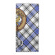 Clan Hannay crest badge surrounded by a strap and buckle over tartan background. Custom text.