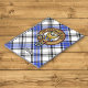 Clan Hannay crest badge surrounded by a strap and buckle over tartan background. Custom text.