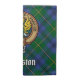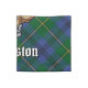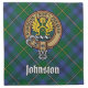 Clan Johnston crest badge surrounded by a strap and buckle over tartan background. Custom text.