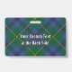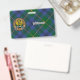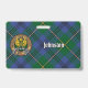 Clan Johnston crest badge surrounded by a strap and buckle over tartan background. Custom text on both sides.
