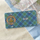 Clan Keith crest badge surrounded by a strap and buckle over tartan background. Custom text.