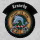 Clan Kennedy crest badge surrounded by a strap and buckle over tartan background. Custom text.